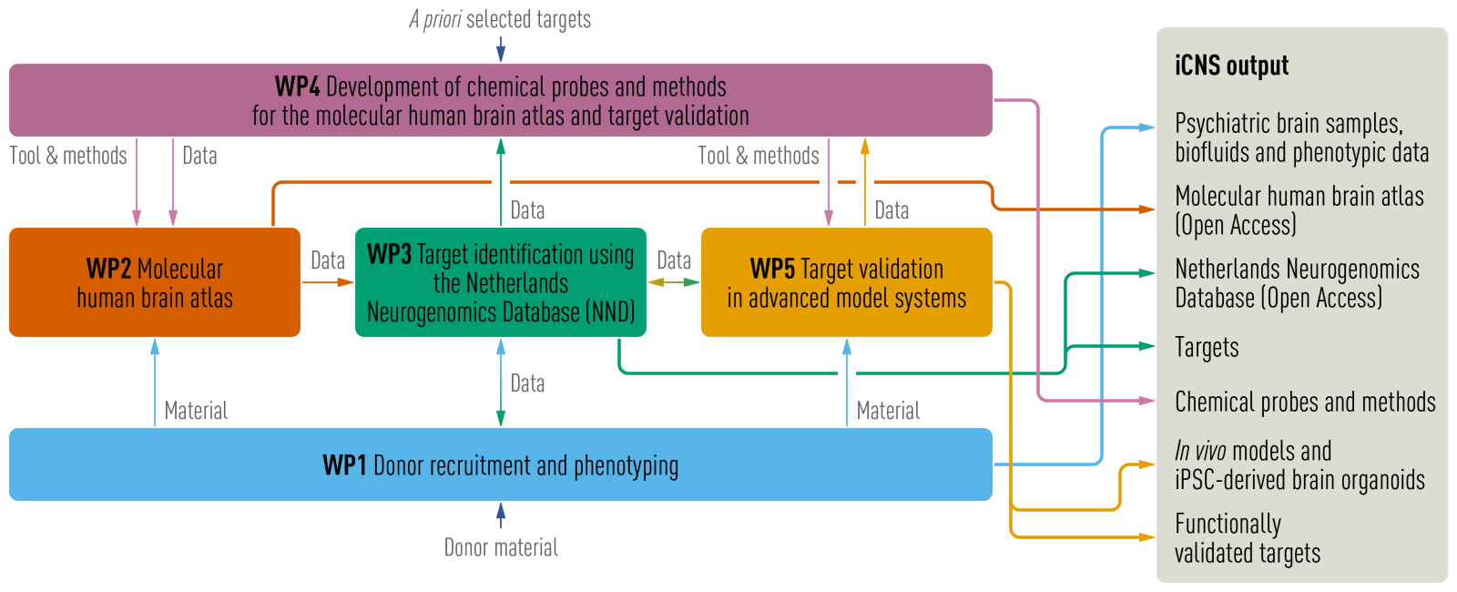 Werkpakket 1 heeft als doel het ondersteunen en aanvullen van het langetermijn hersendonorprogramma van de Nederlandse Hersenbank (NBB). Hiervoor wordt hersenweefsel van goed gekarakteriseerde donoren verzamelt om fundamenteel en translationeel psychiatrisch onderzoek te faciliteren. Het vergaren van hoogwaardig diep-fenogetypeerd hersenmateriaal van patiënten met neuropsychiatrische stoornissen en controlepersonen is van belang voor de internationale onderzoeksgemeenschap en Nederlandse onderzoekers, waaronder het iCNS-consortium.